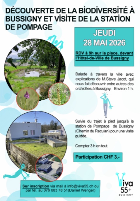 RV à 9h sous le chapiteau devant l'Hôtel-de-Ville pour une sortie Biodiversité et la visite de la Station de Pompage STAP à Bussigny. La sortie est organisé par Viva55+, mais est aussi ouvert pour des personnes qui ont moins que 55ans.