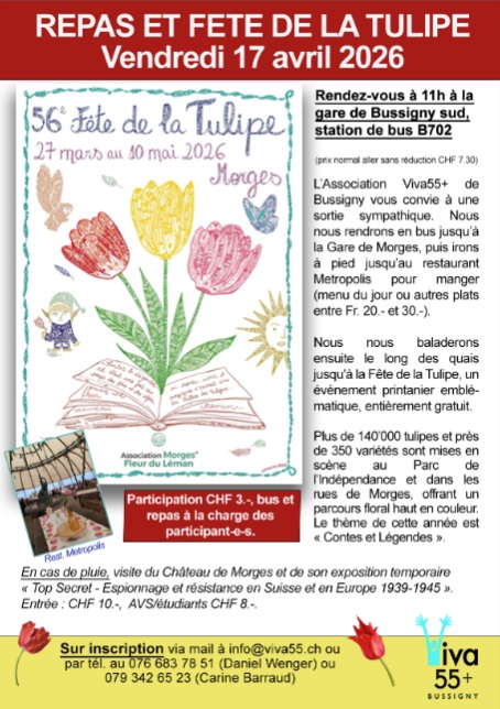 Viva55+ organise une sortie socioculturel le Vendredi 17 avril 2026 pour visiter la fête de la Tulipe à Morges.RV à 11h à la station de bus B702 à la gare sud de Bussigny. Départ du bus 11h07 jusqu'à la gare de Morges. Frais de participation Fr. 3.-/personne . Repas et transport public à vos frais.